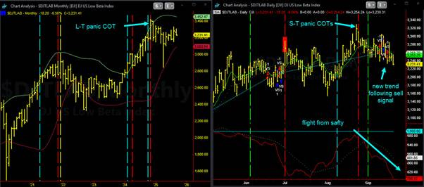 The low-beta stock index $DJTLAB has marked out a clear peak. That top coincided with our volatility model flashing panic buying at the end of 2024. That peak lead to a 20% decline in the low-risk segment, making a low with all the markets on April 7, 2025.